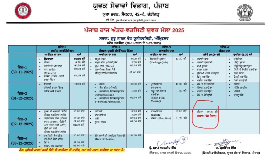 ਚੰਡੀਗੜ੍ਹ, 26 ਨਵੰਬਰ, 2025 (ਚੜ੍ਹਦੀਕਲਾ ਬਿਊਰੋ) : ਪੰਜਾਬ ਰਾਜ ਅੰਤਰ-ਯੂਨੀਵਰਸਿਟੀ ਯੁਵਕ ਮੇਲਾ ਗੁਰੂ ਨਾਨਕ ਦੇਵ ਯੂਨੀਵਰਸਿਟੀ ਅੰਮ੍ਰਿਤਸਰ ਵਿਖੇ 30 ਨਵੰਬਰ ਤੋਂ ਸ਼ੁਰੂ ਹੋਵੇਗਾ ਜਿਸ ਵਿੱਚ 3 ਦਸੰਬਰ ਤੱਕ ਚਾਰ ਦਿਨ ਰਾਜ ਭਰ ਦੀਆਂ ਯੂਨੀਵਰਸਿਟੀਆਂ ਤੋਂ ਸੱਭਿਆਚਾਰਕ, ਕਲਾਤਮਕ, ਗਾਇਨ, ਡਾਂਸ, ਆਦਿ ਵਰਗਾਂ ਵਿੱਚ ਜੋਸ਼ੀਲੇ ਮੁਕਾਬਲੇ ਅਤੇ ਵਿਦਿਆਰਥੀ ਪ੍ਰਤਿਭਾ ਦਿਖਾਈ ਦੇਵੇਗੀ।