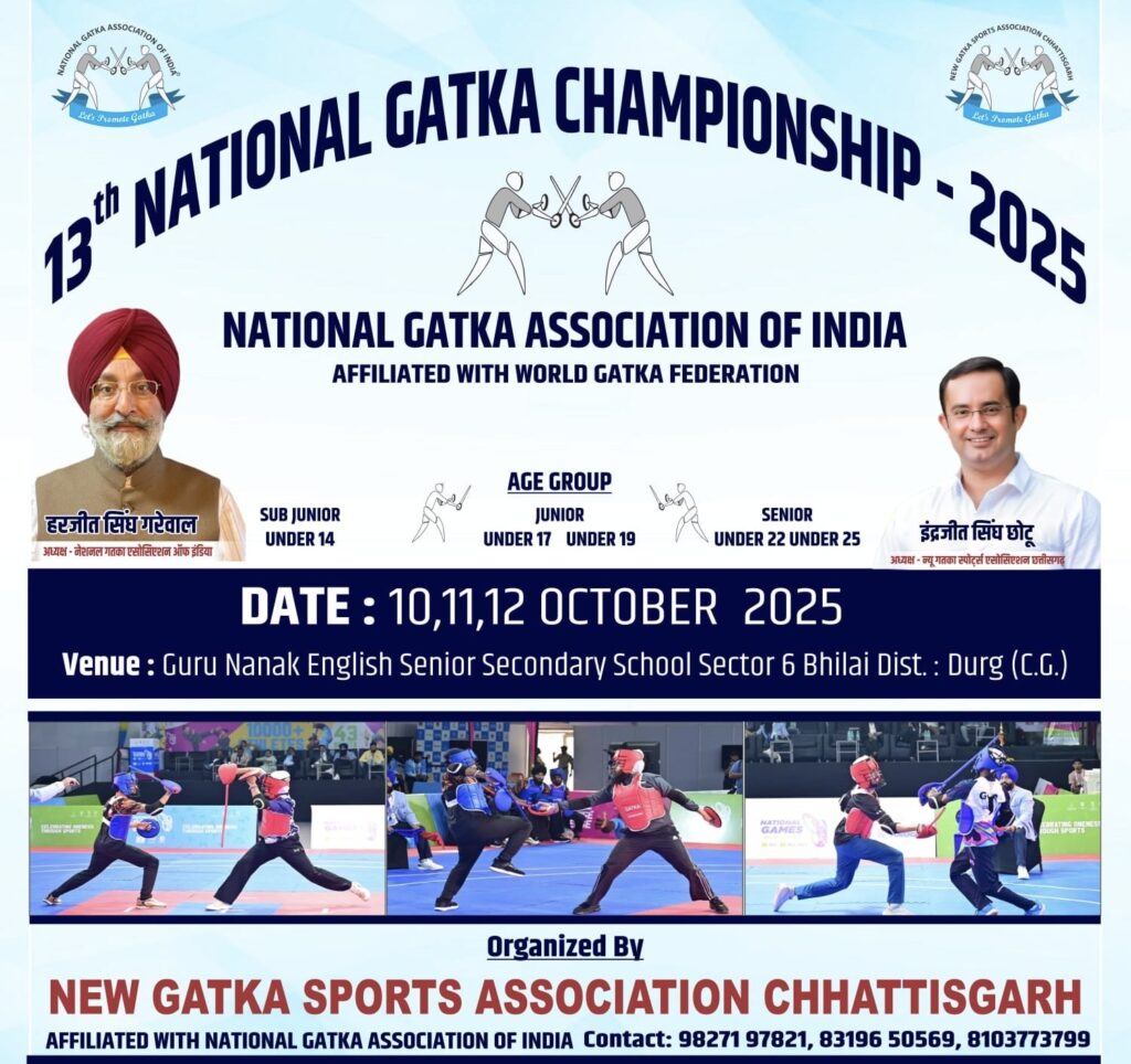 ਚੰਡੀਗੜ੍ਹ, 2 ਅਕਤੂਬਰ, 2025 (ਚੜ੍ਹਦੀਕਲਾ ਬਿਊਰੋ) : ਵਿਸ਼ਵ ਗੱਤਕਾ ਫੈਡਰੇਸ਼ਨ ਤੇ ਏਸ਼ੀਅਨ ਗੱਤਕਾ ਫੈਡਰੇਸ਼ਨ ਨਾਲ ਸੰਬੰਧਿਤ ਦੇਸ਼ ਦੀ ਪਹਿਲੀ ਰਜਿਸਟਰਡ ਗੱਤਕਾ ਸੰਸਥਾ, ਨੈਸ਼ਨਲ ਗੱਤਕਾ ਐਸੋਸੀਏਸ਼ਨ ਆਫ਼ ਇੰਡੀਆ (ਐਨ.ਜੀ.ਏ.ਆਈ.) ਵਲੋਂ 10 ਤੋਂ 12 ਅਕਤੂਬਰ, 2025 ਤੱਕ ਛੱਤੀਸਗੜ੍ਹ ਦੇ ਦੁਰਗ ਜ਼ਿਲ੍ਹੇ ਦੇ ਭਿਲਾਈ ਸ਼ਹਿਰ ਵਿੱਚ ਸਥਿਤ ਗੁਰੂ ਨਾਨਕ ਇੰਗਲਿਸ਼ ਸੀਨੀਅਰ ਸੈਕੰਡਰੀ ਸਕੂਲ ਵਿਖੇ 13ਵੀਂ ਨੈਸ਼ਨਲ ਗੱਤਕਾ (ਪੁਰਸ਼ ਤੇ ਮਹਿਲਾ) ਚੈਂਪੀਅਨਸ਼ਿਪ ਕਰਵਾਈ ਜਾ ਰਹੀ ਹੈ। ਕੌਮੀ ਪੱਧਰ ਦਾ ਇਹ ਟੂਰਨਾਮੈਂਟ ਨਿਊ ਗੱਤਕਾ ਸਪੋਰਟਸ ਐਸੋਸੀਏਸ਼ਨ ਛੱਤੀਸਗੜ੍ਹ ਦੇ ਸਹਿਯੋਗ ਨਾਲ ਕਰਵਾਇਆ ਜਾ ਰਿਹਾ ਹੈ ਜਿਸ ਵਿੱਚ ਵੱਖ-ਵੱਖ ਰਾਜਾਂ ਦੀਆਂ ਗੱਤਕਾ ਟੀਮਾਂ ਤਿੰਨ ਦਿਨਾਂ ਤੱਕ ਗੱਤਕਾ-ਸੋਟੀ ਅਤੇ ਫੱਰੀ-ਸੋਟੀ ਵਿੱਚ ਗਹਿ-ਗੱਚਵੇਂ ਵਿਅਕਤੀਗਤ ਅਤੇ ਟੀਮ ਮੁਕਾਬਲਿਆਂ ਦੀ ਲੜੀ ਵਿੱਚ ਹਿੱਸਾ ਲੈਣਗੀਆਂ।